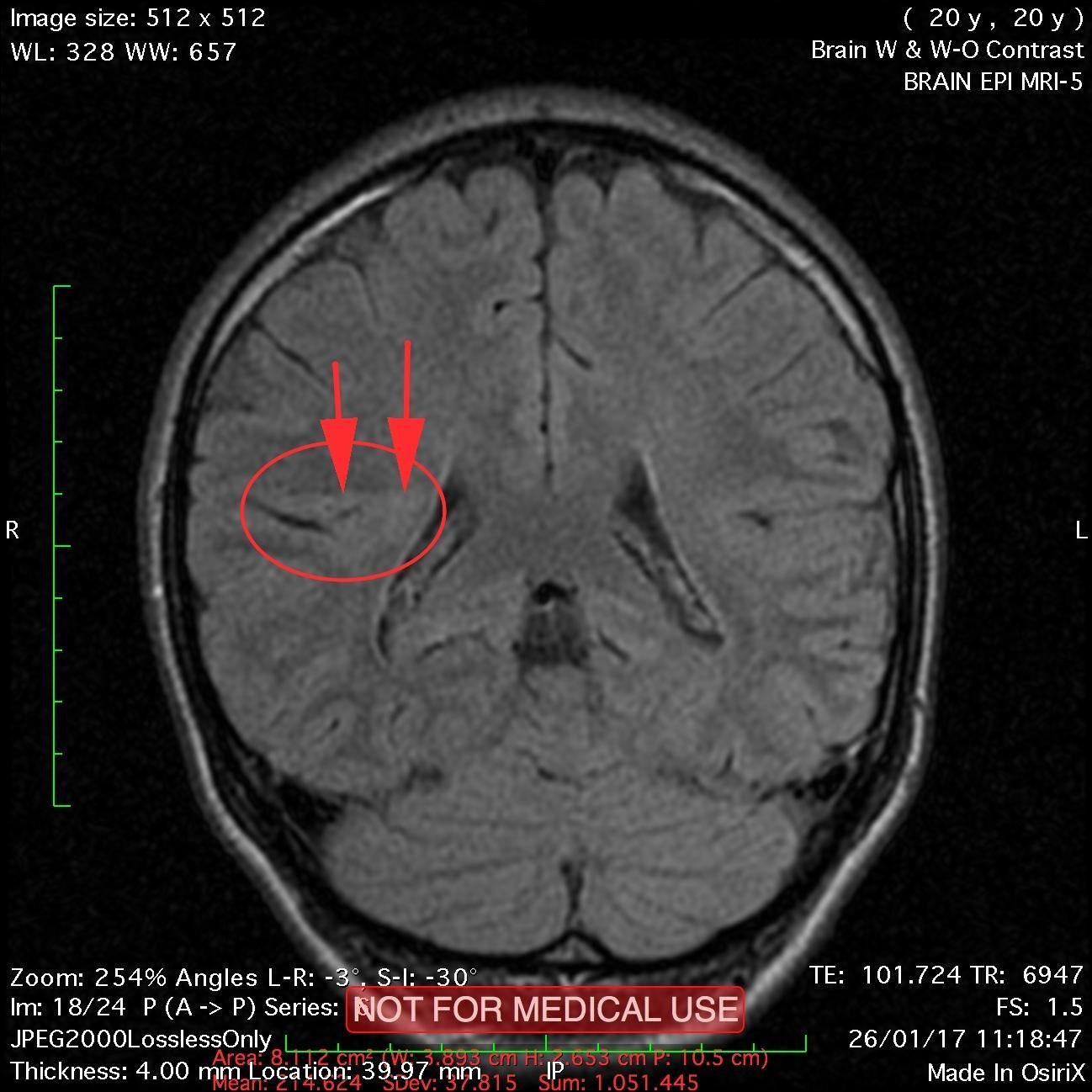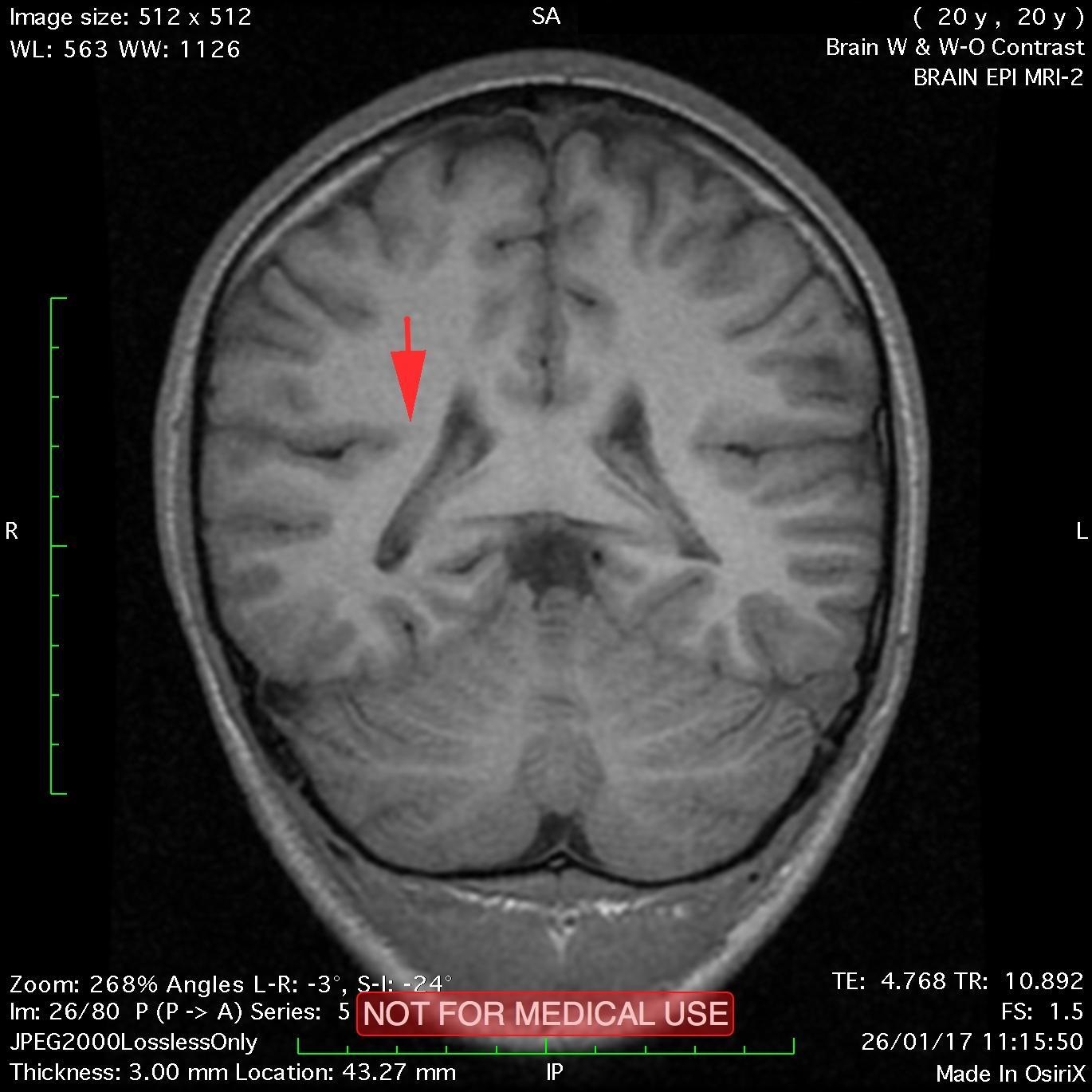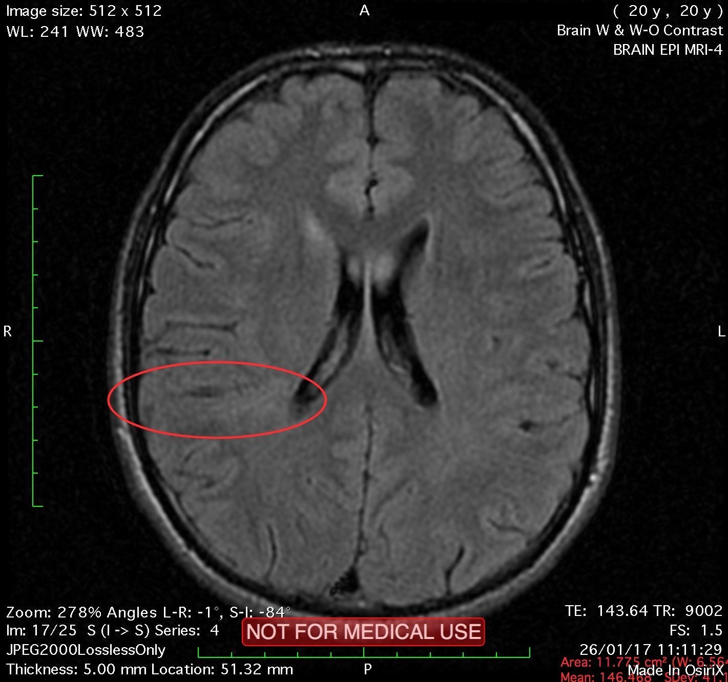This recent MRI exam WITHOUT Contrast in IHC, revealed a subtle congenital malformation of cortical development within right parietal lobe.