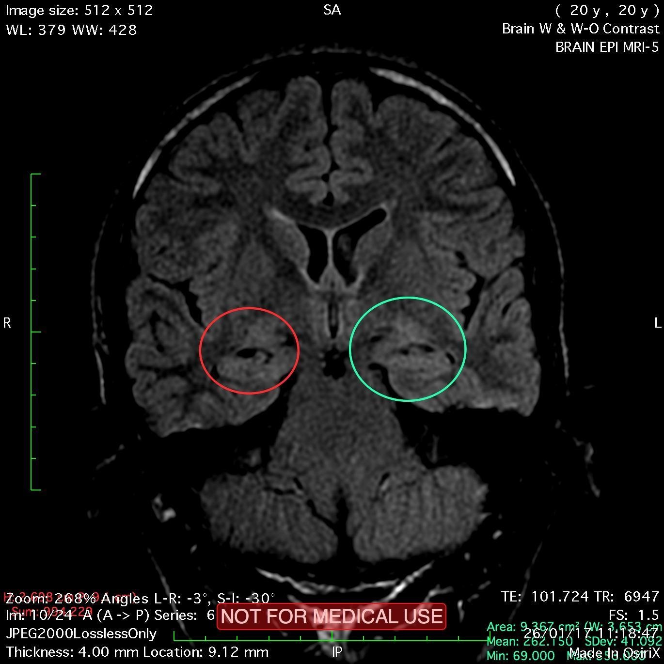 Secondary hippocampal sclerosis is identified, bilaterally (secondary to long-term intractable epilepsy).
